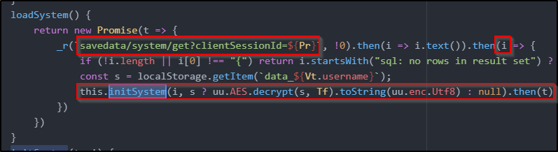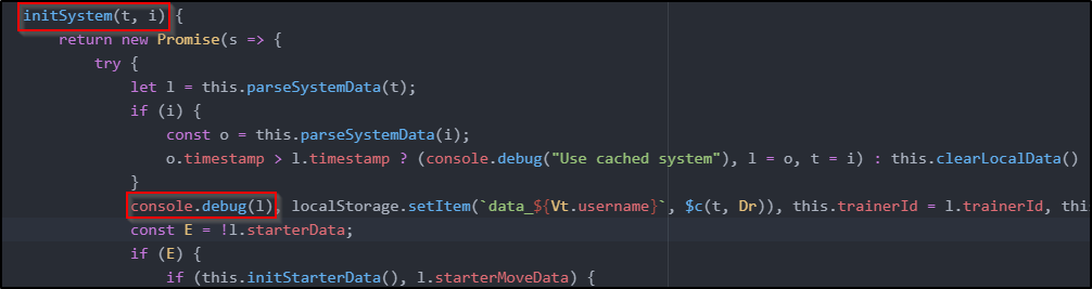 Nice clean JavaScript. Another copy paste and I have a readable file on my PC. Going off the above screenshot, it appears the data we are after is coming from an input into the ‘initSystem’ function called ‘t’. It also appears there is a comparison being done between the timestamp of cached data (i) and this 't' data. Let’s see where this ‘initSystem’ function is being called