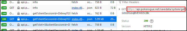 The URL structure there matches what I found in the source code, so we officialy have our FQDN, ‘api.pokerogue.net’. I'll note that down for later. While I’m here I’ll also copy and paste the raw response JSON into a local file called ‘systemsavedata.json’. I recommend you do the same for later.