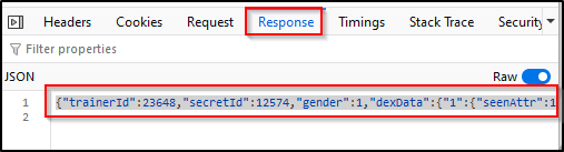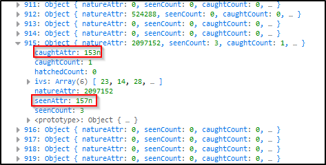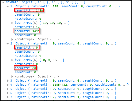 The ‘dexData’ object appears to contain what I’m looking for. It is a very large JSON object (1000+ entries) that appears to contain data about the Pokémon we’ve encountered in the game. The values that really peak my interest are ‘caughtAttr’ and ‘seenAttr’.