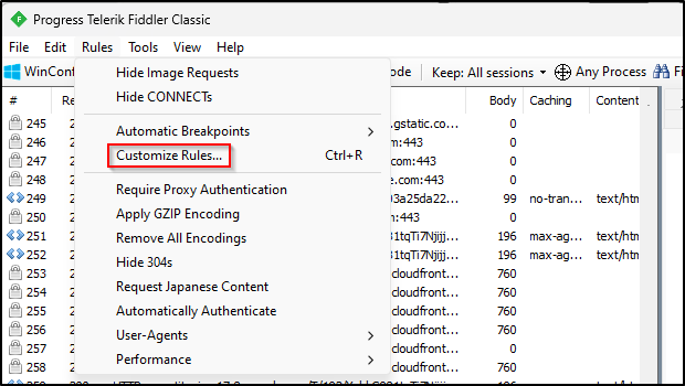 Once Fiddler Classic is downloaded I’ll open up the app and go to Rules → Customize Rules…