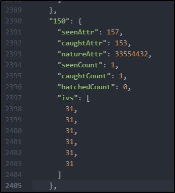 I went ahead and filled in the values you see there. All these values I got from the Lechonk entry, except for ‘natureAttr’ and ‘ivs’. Being a Pokénerd myself, I know that ideal IVs for a Pokémon are 31 across the board. This essentially means our Mewtwo will be as powerful as possible. For the ‘natureAttr’ value, I copied the value from one of the already unlocked starters, since they all have neutral natures. I won’t bother explaining that at all, just believe me it’s beneficial.
