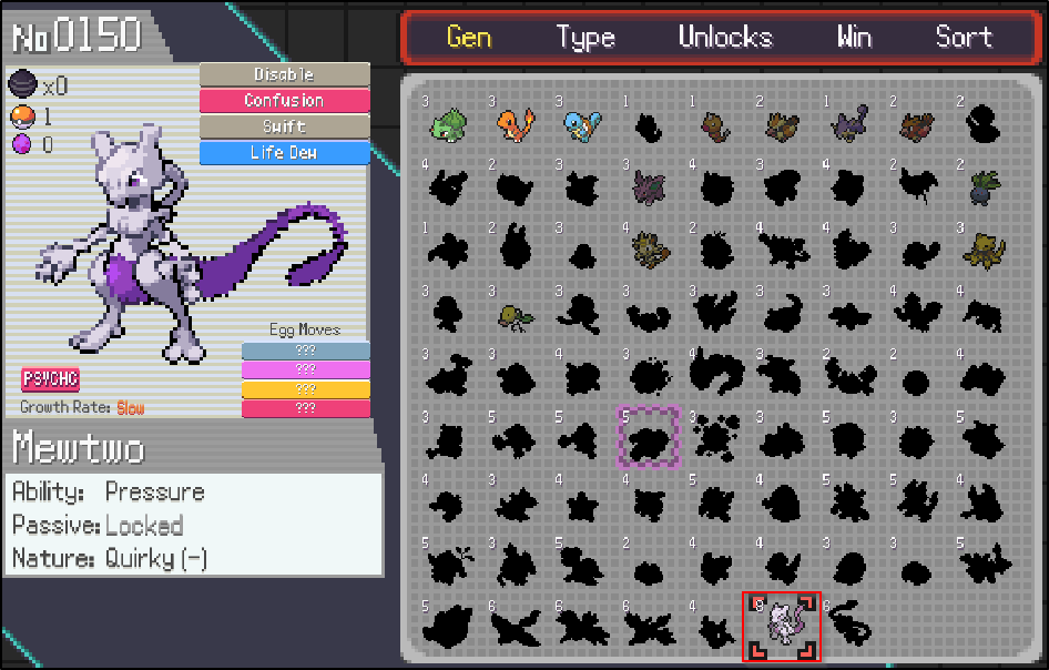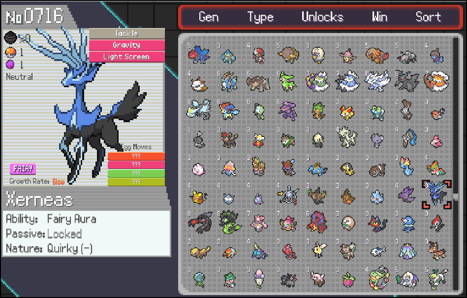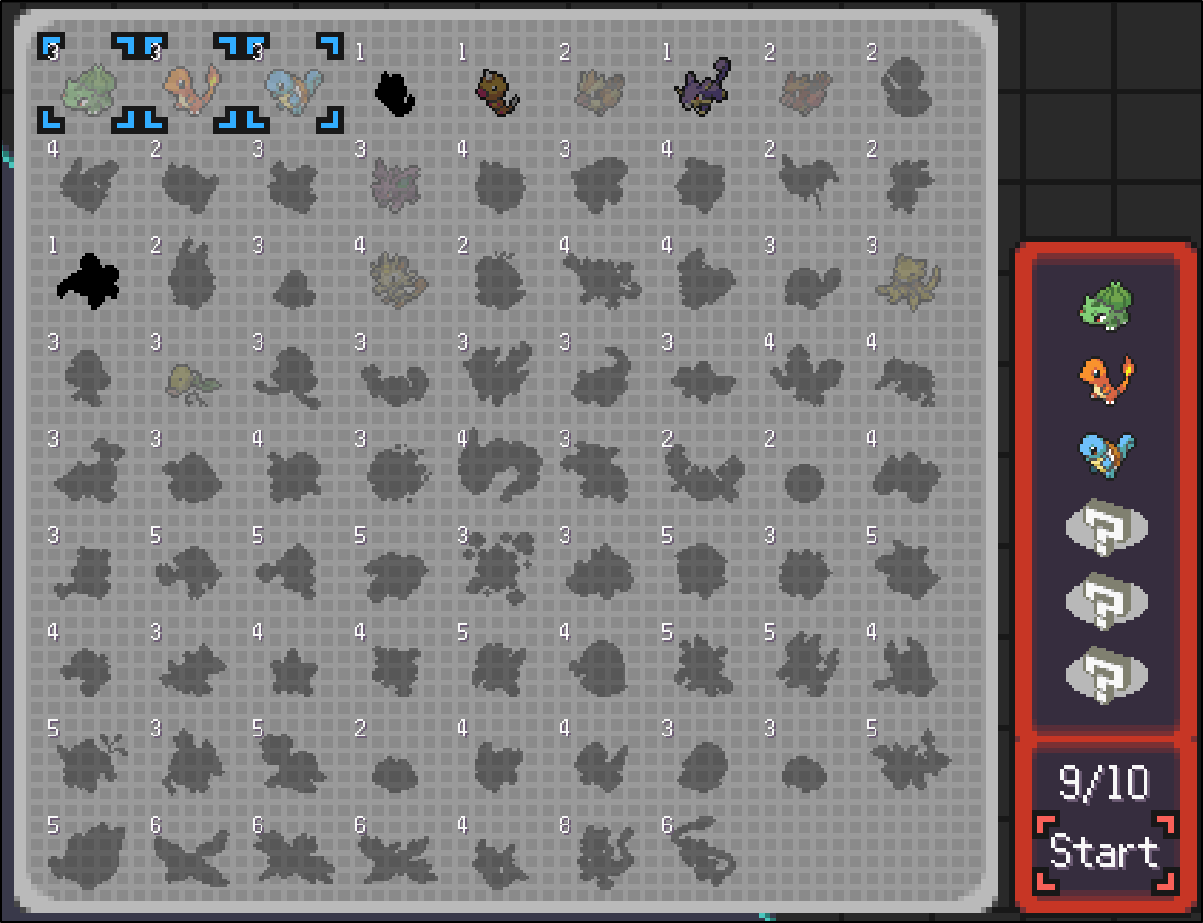 The concept of this game is simple: you start by picking 3 Pokémon for your journey. You are initially limited to the 3 starter Pokémon options from the now 9 core Pokémon games that have been released (3 * 9 = 27 choices initially). As of writing there are officially 1,025 unique Pokémon, so this pool feels a bit limited. This game foregoes the exploration and story that are present in typical Pokémon games and instead tosses you right into a Pokémon battle gauntlet, throwing enemy wild Pokémon and Pokémon trainers against your team until all your party Pokfémon faint. Along the way you can capture enemy wild Pokémon which are then added to your party, which can hold a maximum of 6 Pokémon at any time.