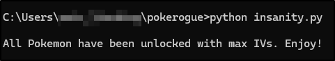 Are you at all wondering what the ‘insanity.py’ file is for in the ‘pokerogueapi’ directory? Wonder no more. This script automatically updates the ‘systemsavedata.json’ file to unlock ALL Pokémon in the game with max IVs. Running it is pretty simple: