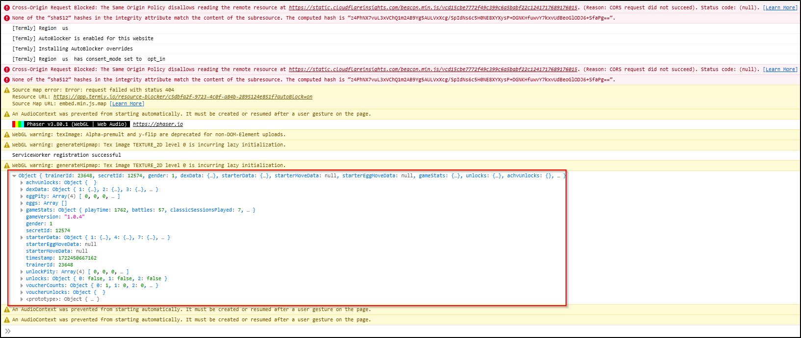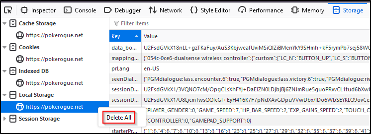 Alright, that was pretty fun. Here’s an important note: once you are done with these shenanigans and turn off Fiddler Classic, it is important to clear all the ‘Local Storage’ values in your browser cache BEFORE logging back into PokéRogue. Here’s how to do that in the Firefox web developer console: